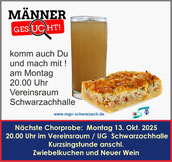 Zum Fahnenweihefest hatte der MGV Schwarzach herzlich eingeladen. Es galt die vollständig restaurierten Vereinsfahnen der Öffentlichkeit vorzustellen und zu weihen verbunden mit Ehrungen langjähriger Sänger und einem Freundschaftssingen. Zu Beginn der Veranstaltung zogen unter den gesungenen Klängen des Badnerliedes alle Chöre mit ihren Vereinsfahnen in die Schwarzachhalle ein. Vorne weg maschierte Hans Knörzer mit der Festtafel des MGV Schwarzach. Er war schon in den fünfziger Jahren als „Täfelesbub“ beim Sängerbund Unterschwarzach dabei. Zehn Chorgemeinschaften sind dem Ruf an den Schwarzbach gefolgt, jenem Gewässer welches eine der beiden Fahnen mit den Worten ehrt „Lass froh dein Lied erschallen als Gruß vom Schwarzbachgrund“. So heißt es seit 1881 im Kleinen Odenwald. Nach der Begrüßung durch den 1. Vorsitzeden Alexander Lingsch erschallte jede Menge Liedgut von traditionell bis morden, von englisch bis kaukasisch, von Gospel bis Volksmusik, von Mendelssohn Bartholdy bis Maffay . Nach der Badenhymne und dem „Wasser vom Schwarzbach“ folgte die Schwabenhymne „Mir im Süden“ vorgetragen vom MGV Liederkranz Reichartshausen unter der Leitung von Eric Grunwald. Der Chorleiter der Schwarzacher Sänger Jochen Thurn, der nun seine beiden weiteren Chöre, den MGV Liederkranz Dallau und Chor Royal, ebenfalls auftreten ließ. Einen Gemeinschaftschor hatten der Sängerbund Neunkirchen und der Cäcilienchor Schwarzach gebildet und wurden von Bernadette Karl geleitet. Einziger rein weiblicher Chor war Amicanti aus Sulzbach, dirigiert von Annette Beichert. Gemischt gesungen wurde beim Liederkranz Aglasterhausen unter Leitung von Barbara Beck-Gallus. Der Frohsinn Robern hatte die weiteste Anfahrt und wurde von Philipp Mörsberger dirigiert. Aus dem Kleinen Odenwald kamen die Männer des MGV Schwanheim (Ltg. Frank Christian Aranowski), Liederkranz Asbach (Ltg. Kristian Kimmel) und Eintracht Bargen der von Friedemann Buhl geleitet wurde.